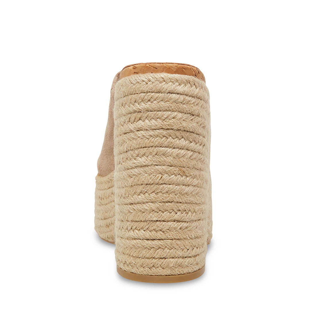 A wide suede strap secures the BECCA sandal to a platform heel sole wrapped in raffia braid.