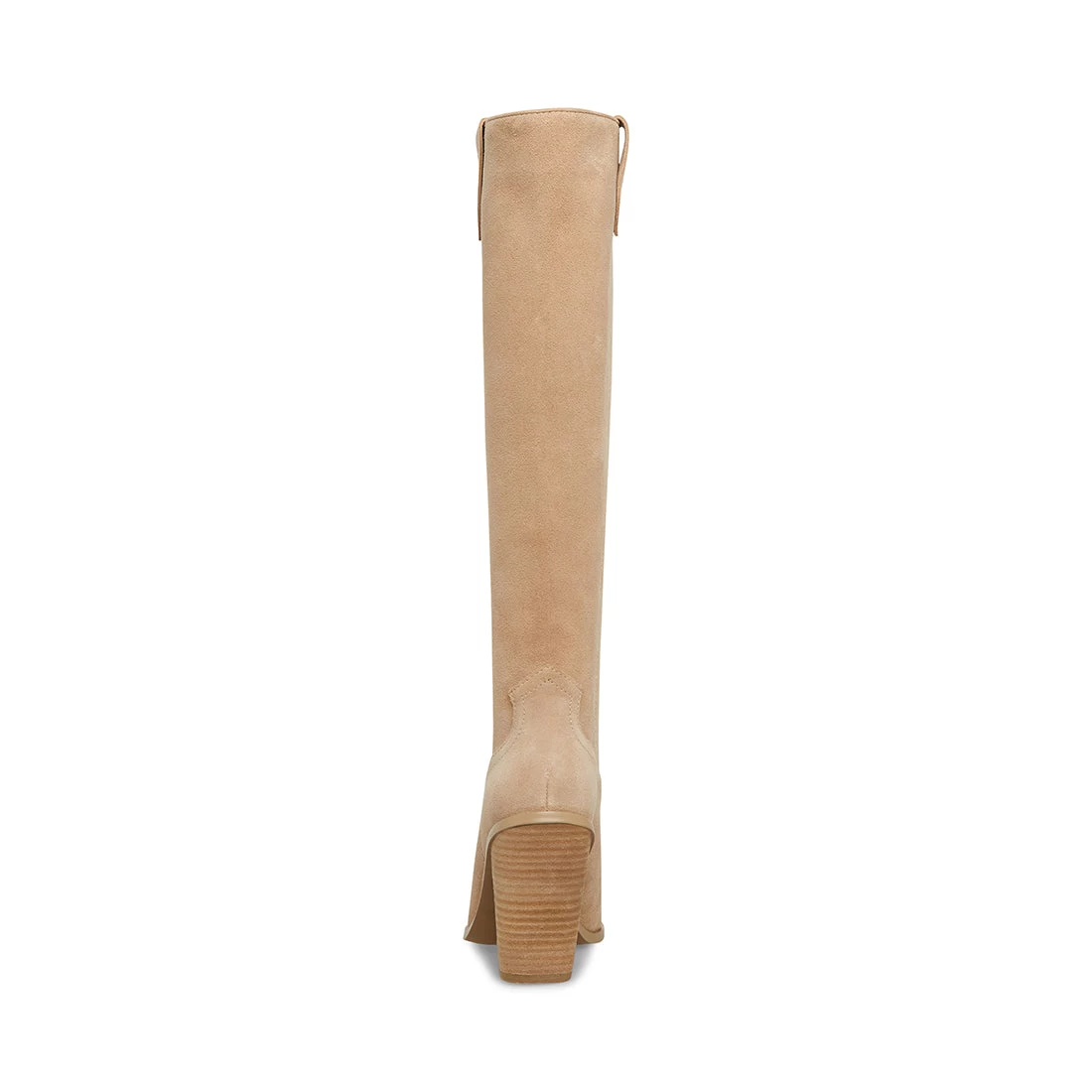 A fully suede knee boot, the BRONDY includes western-inspired details like a point toe and an angled stacked heel, as well as decorative panel cuts to complete the look.