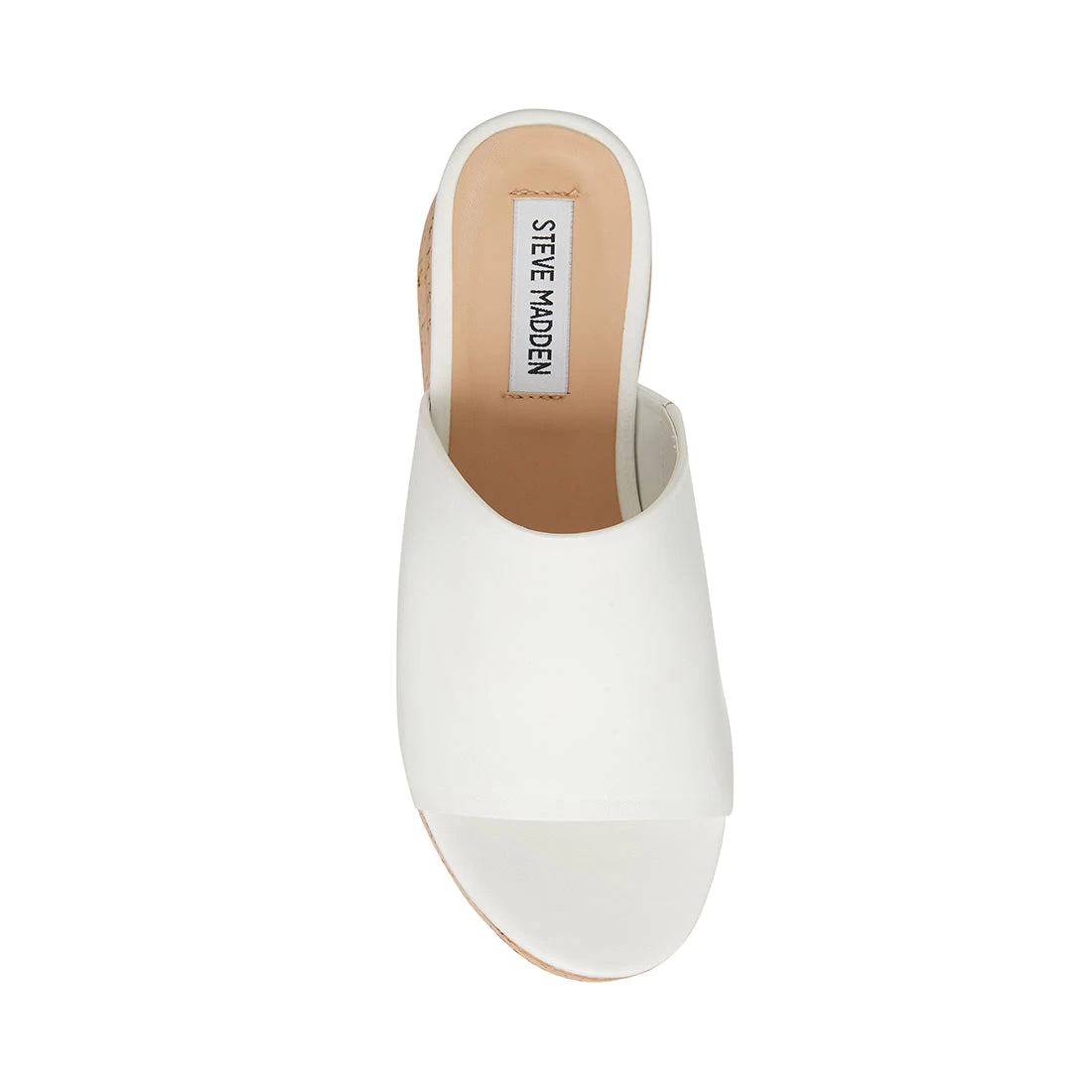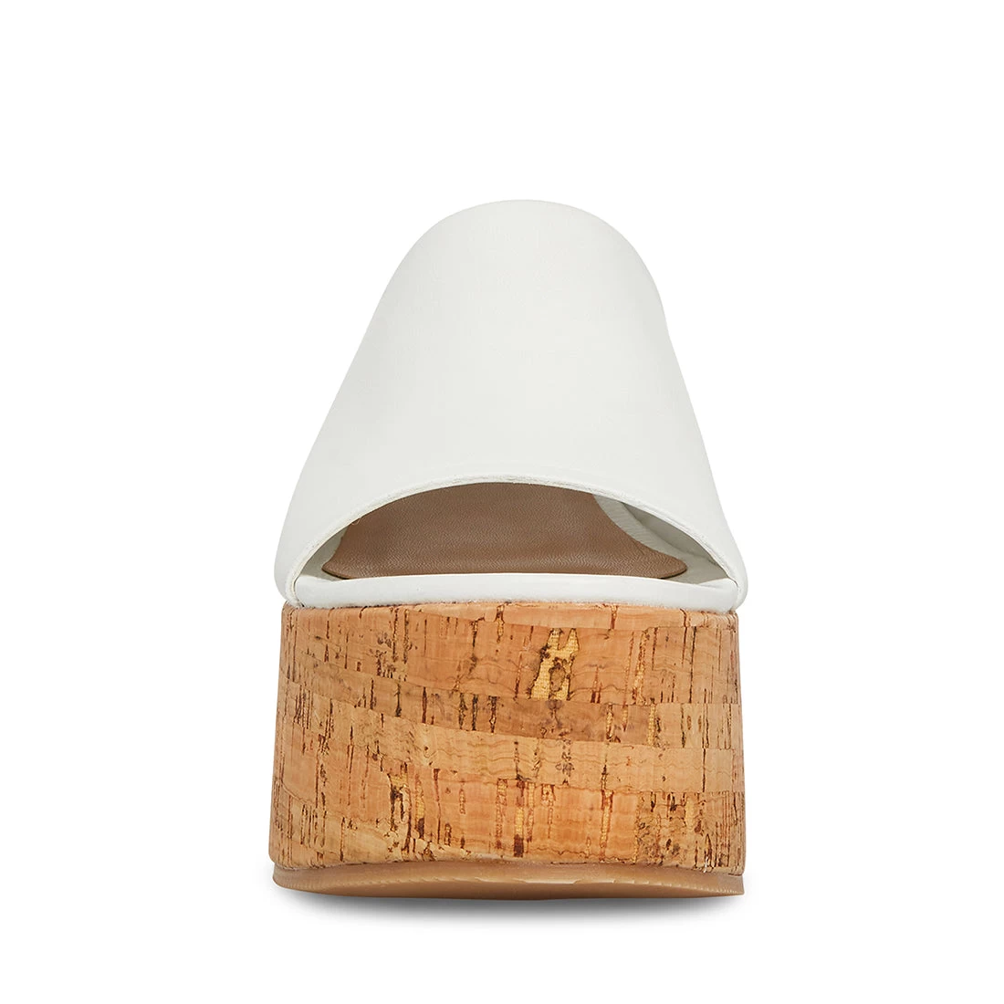 The CALYSTA sandal is a wide leather single strap slide set on a cork wrap platform.
