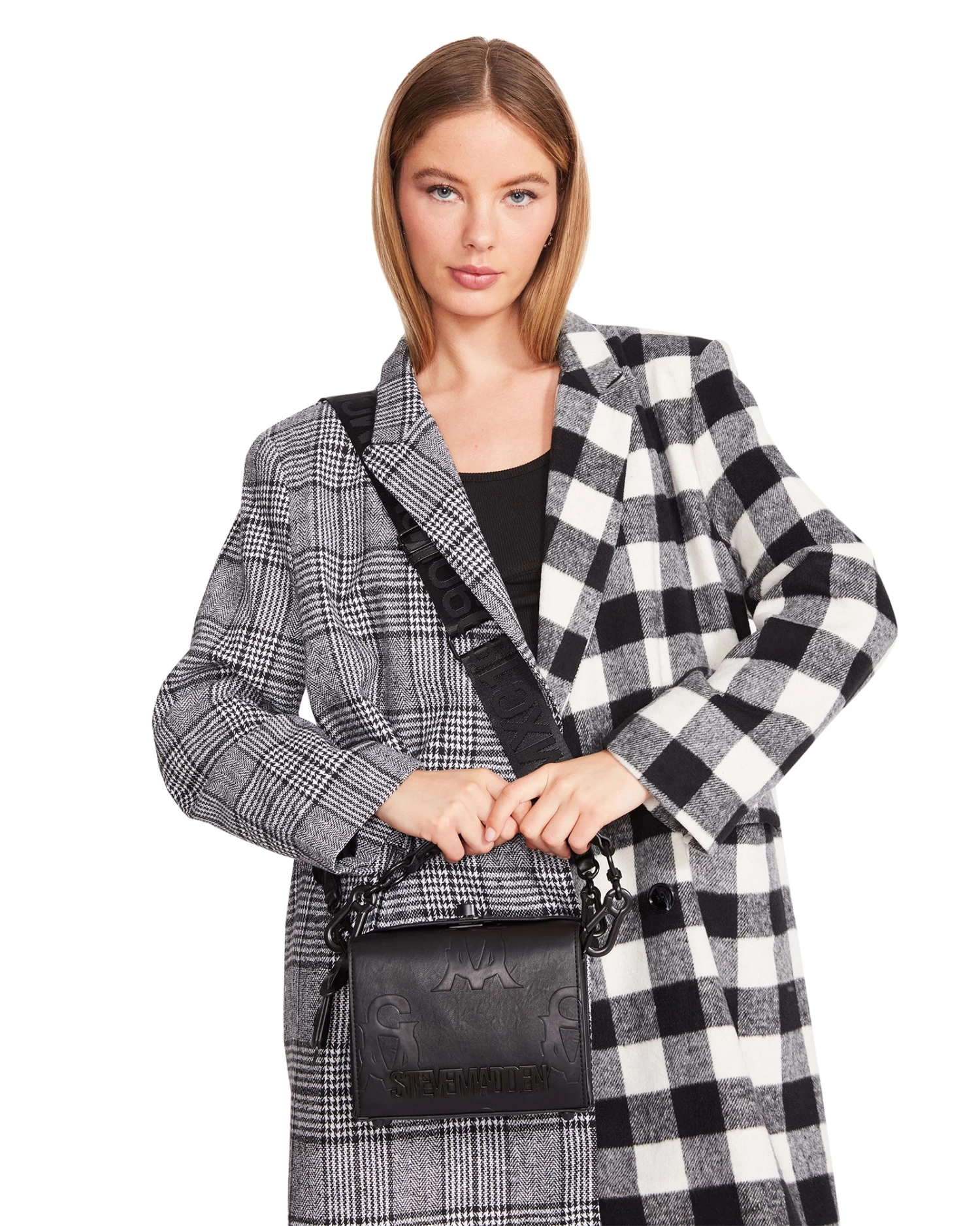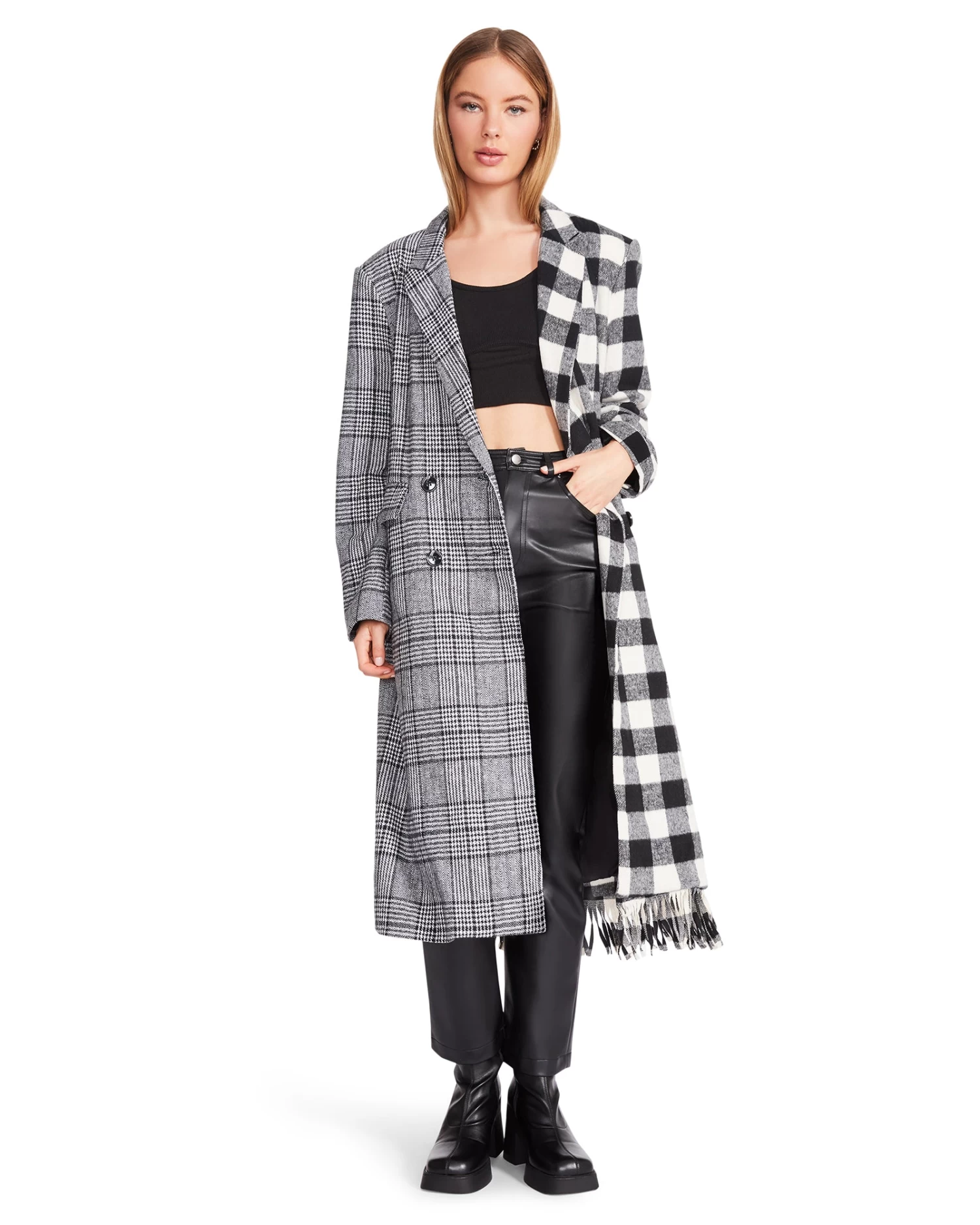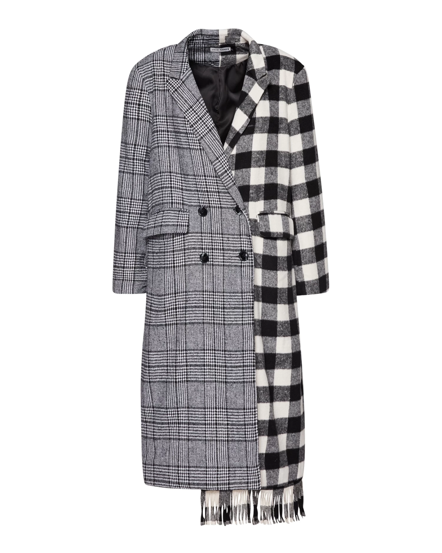 The soft flannel fabric of the EMILYÂ jacket is split vertically, with one side in a houndstooth pattern and the other side in a gingham that’s finished with fringe at the hem.