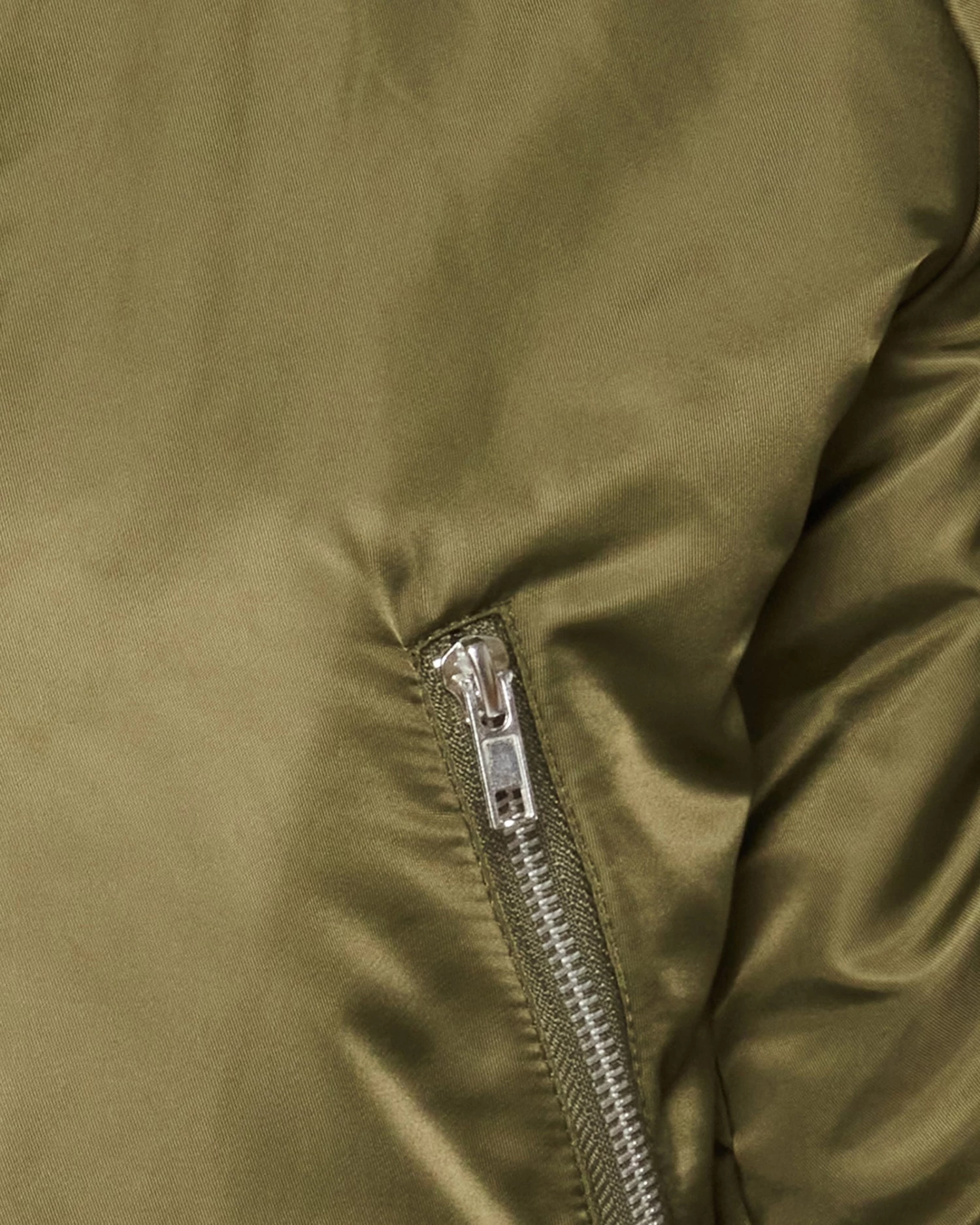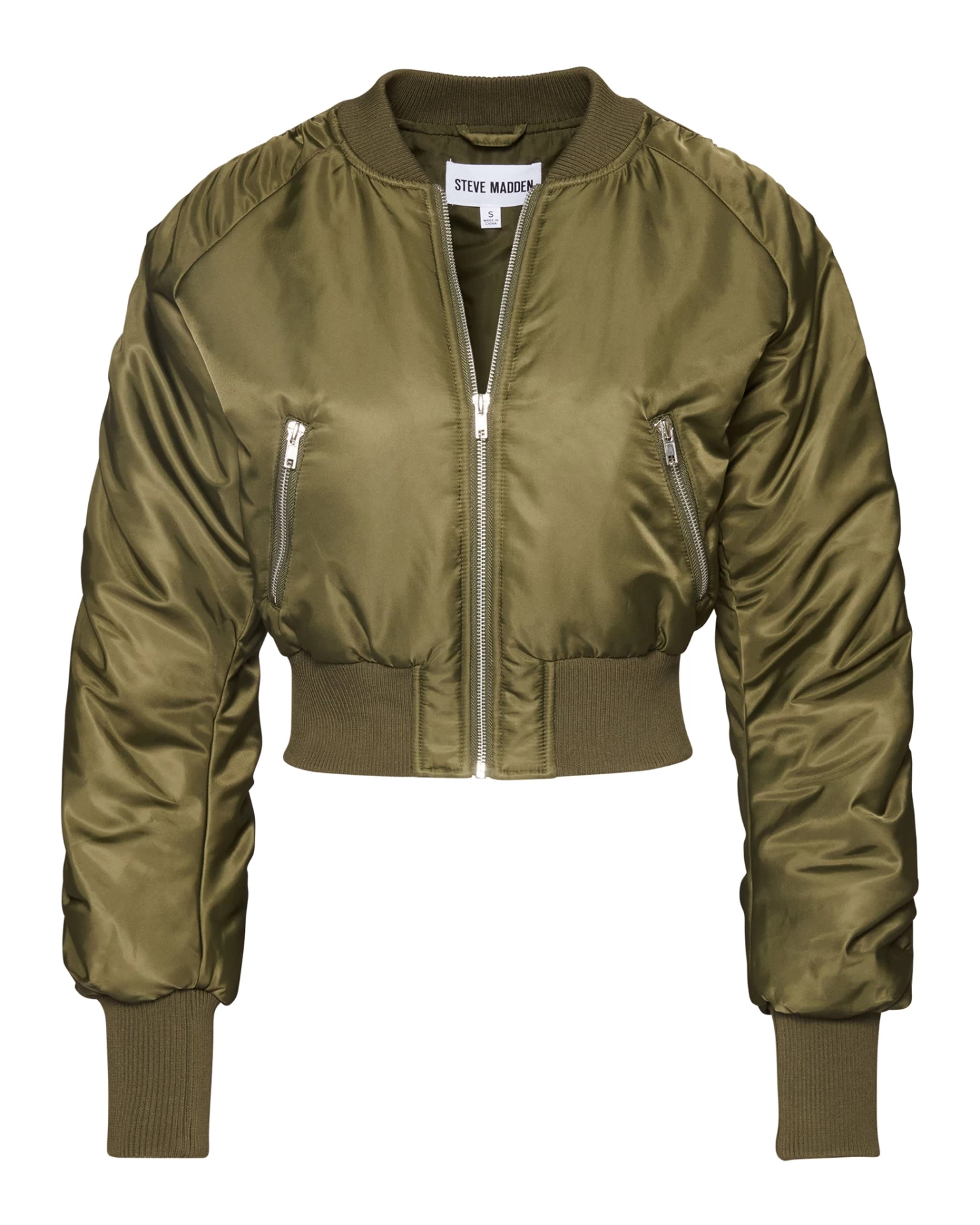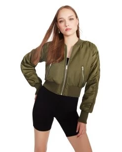 A satin finish gives the EVA bomber jacket classic style, updated with a cropped construction.