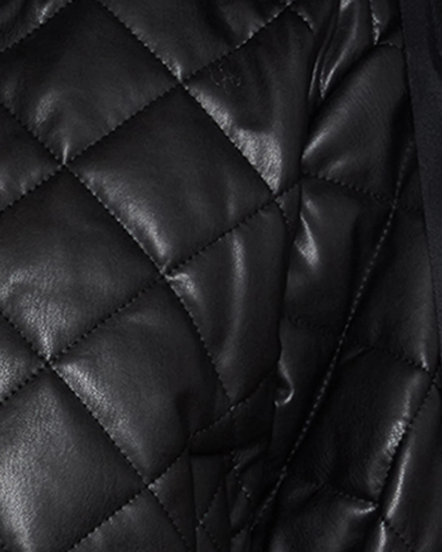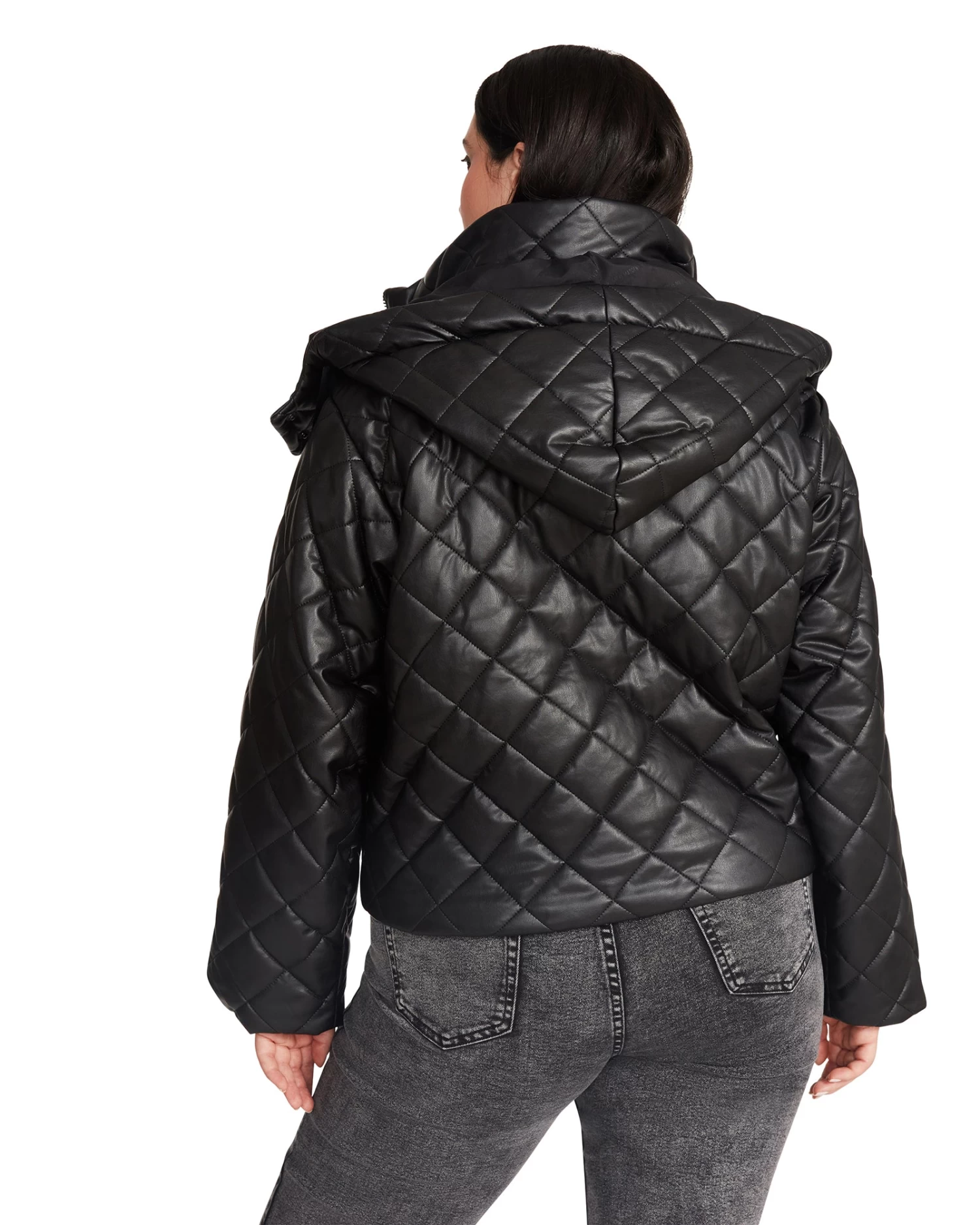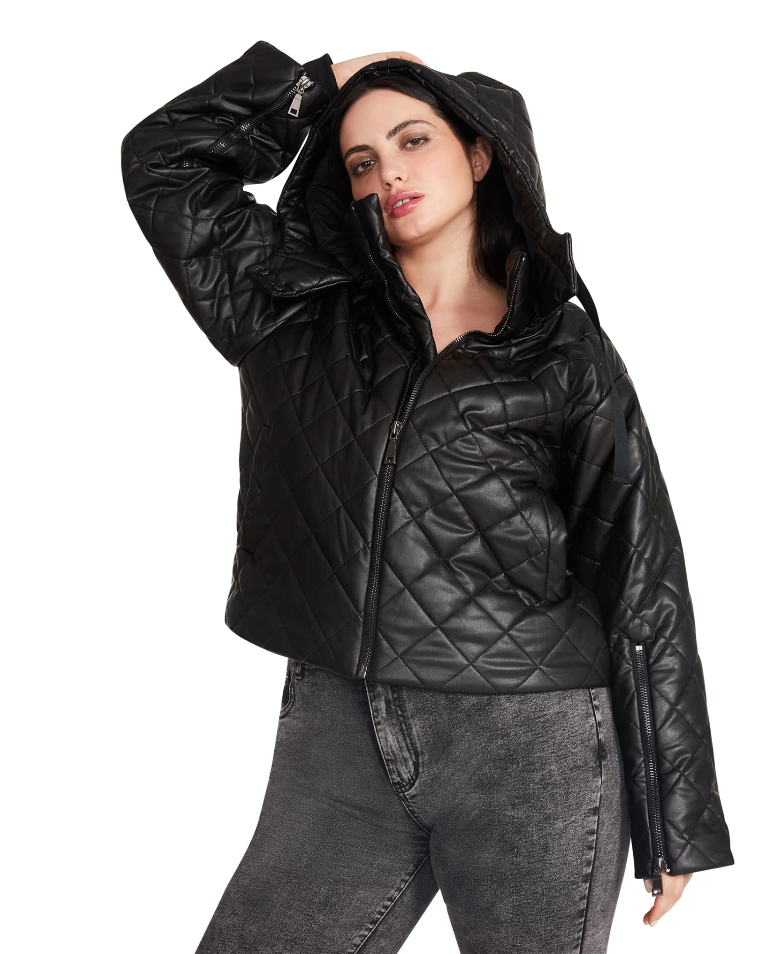 The cropped HAYLE jacket is a fully lined hooded jacket with a quilted shell in vegan leather for a protective outer layer.