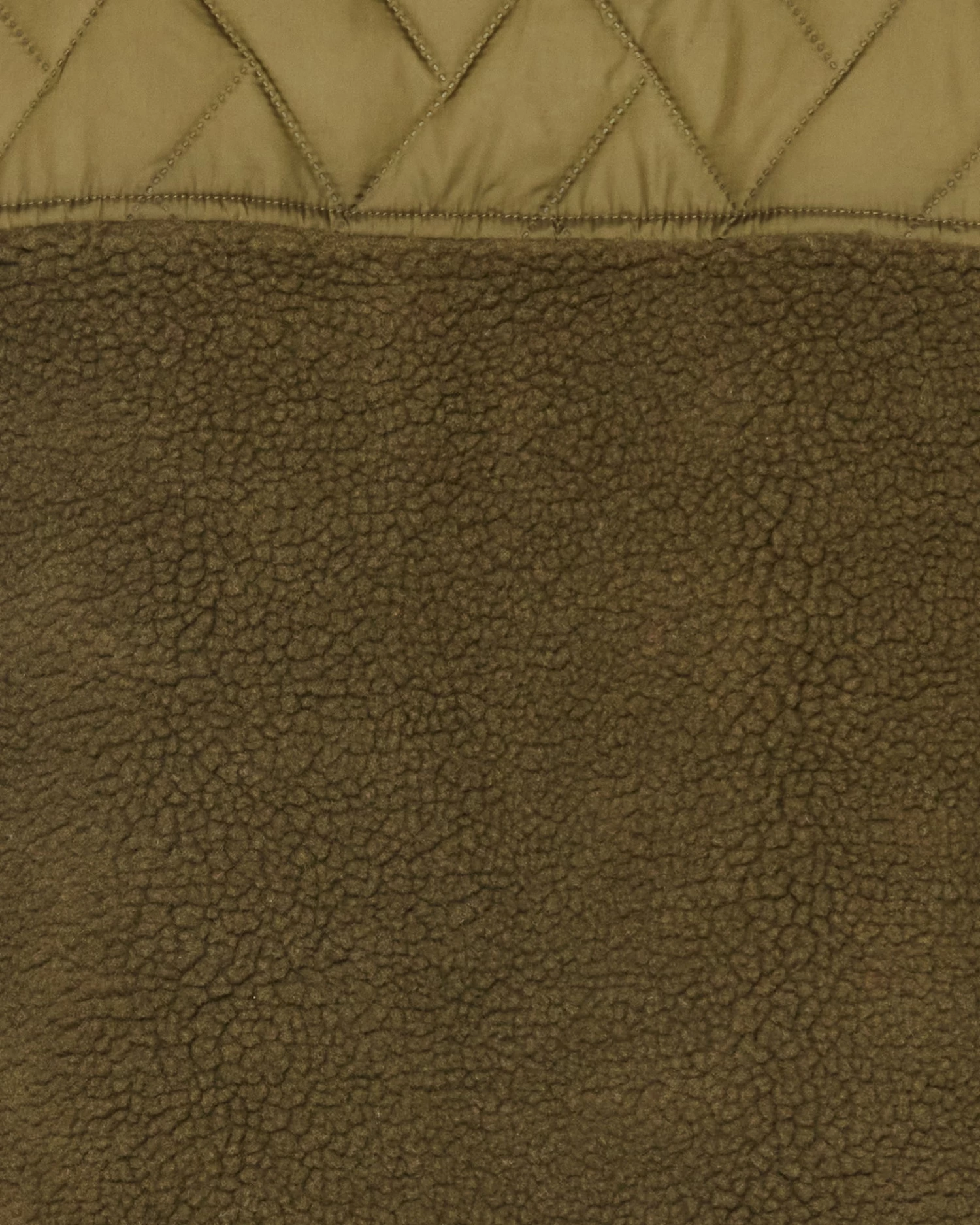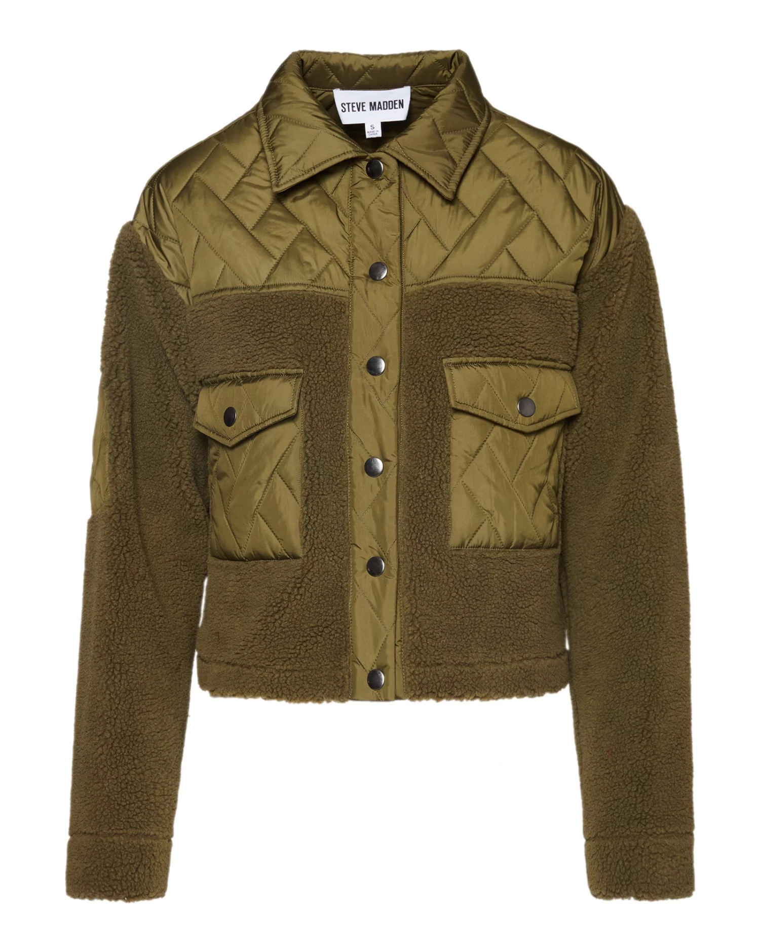 Contrasting textures define the construction of the IRIS jacket, with soft sherpa fabric on the sleeves and torso set against quilted shoulders and pockets.