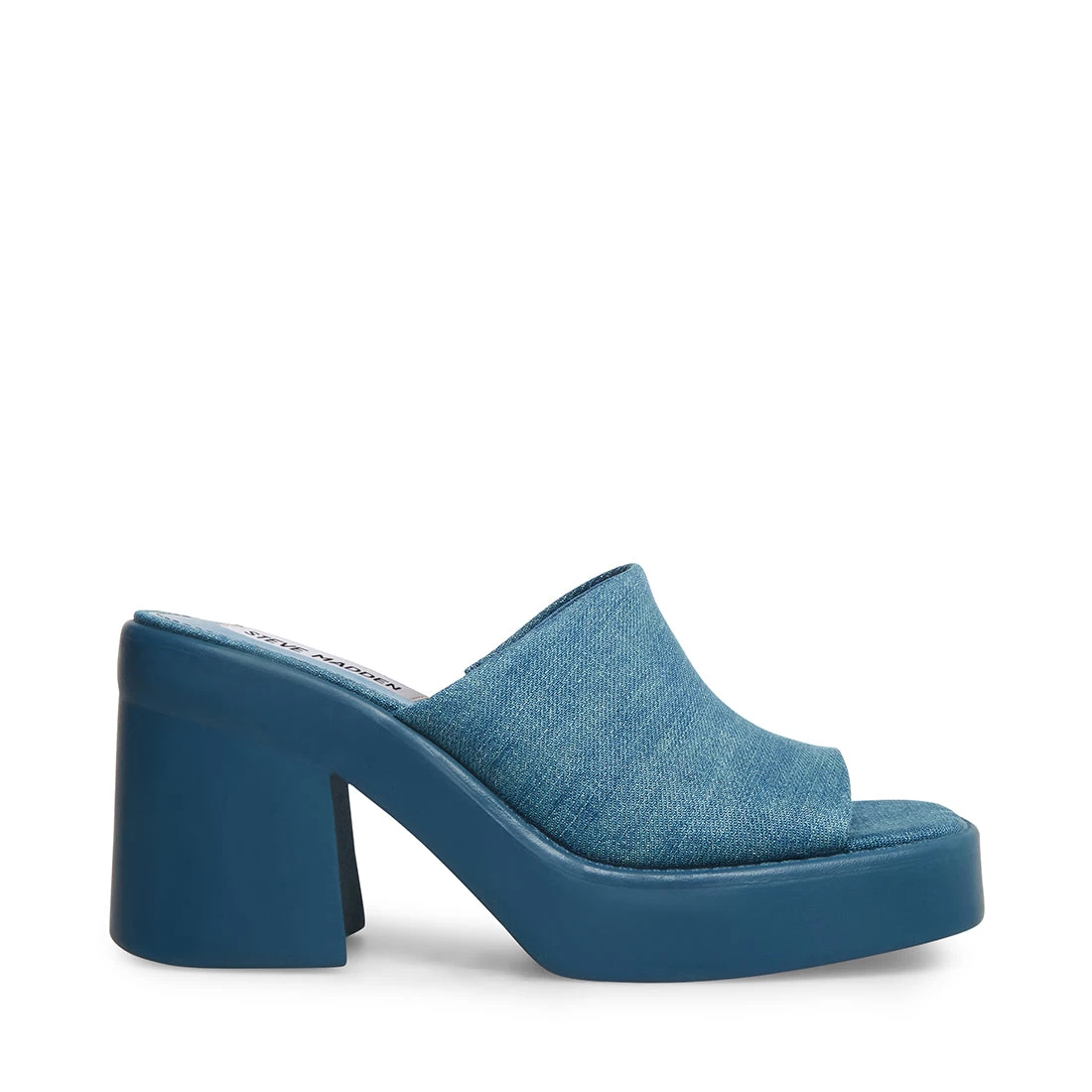 The KANE single-strap slide sandal sits on top of a substantial platform heel finished with a square toe.