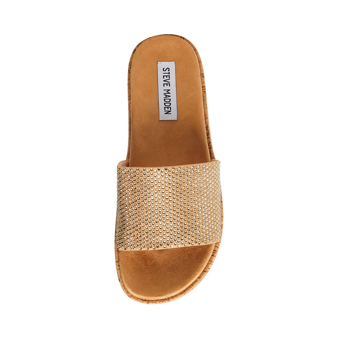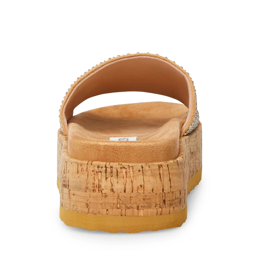 The KASPER-R slide sandal features a wide rhinestone studded strap and faux cork texture flatform with a molded footbed.