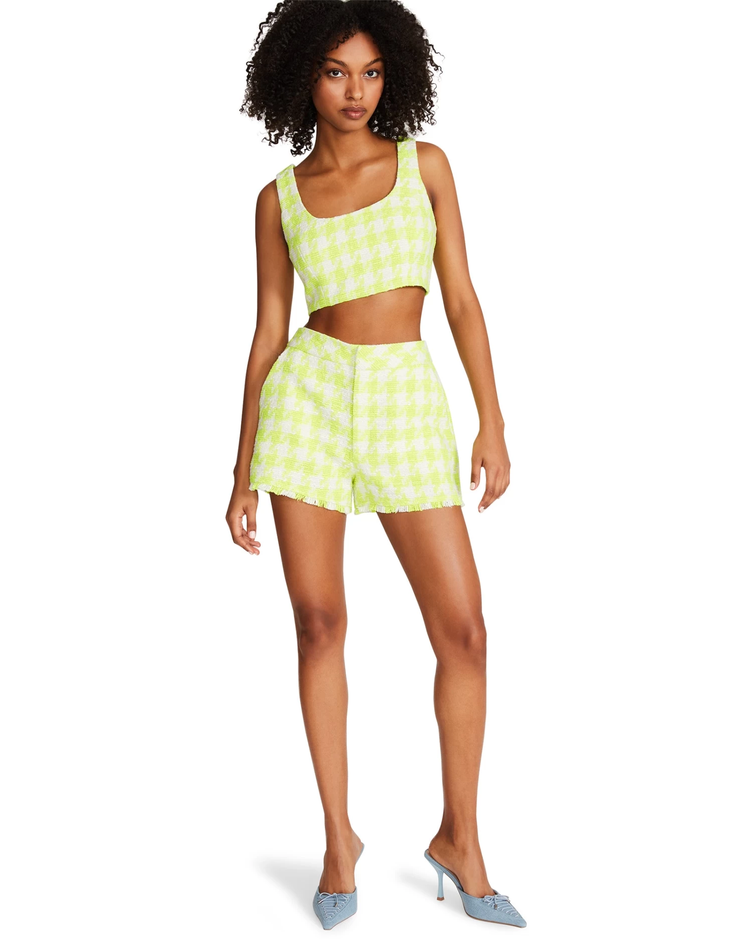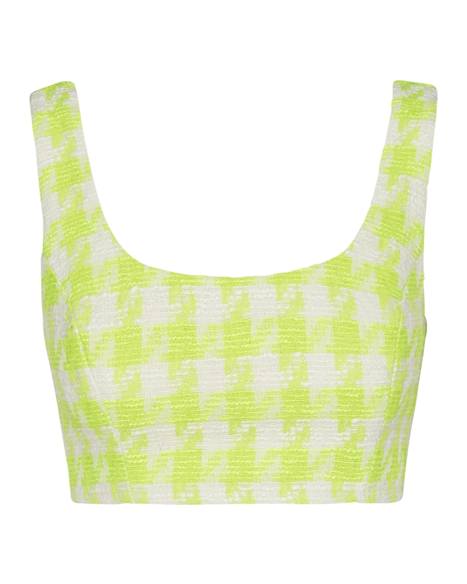 Tweed fabric contrasts with an exposed back zipper to give the tailored LAYLA crop tank top subtle texture and a deconstructed edge.