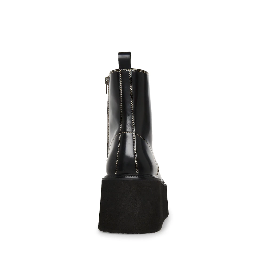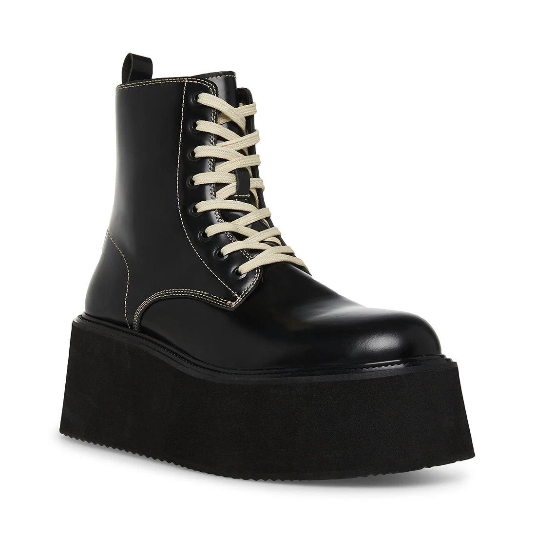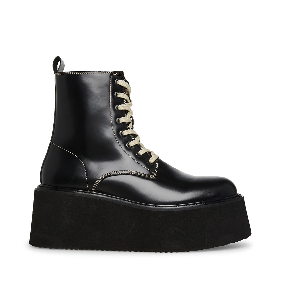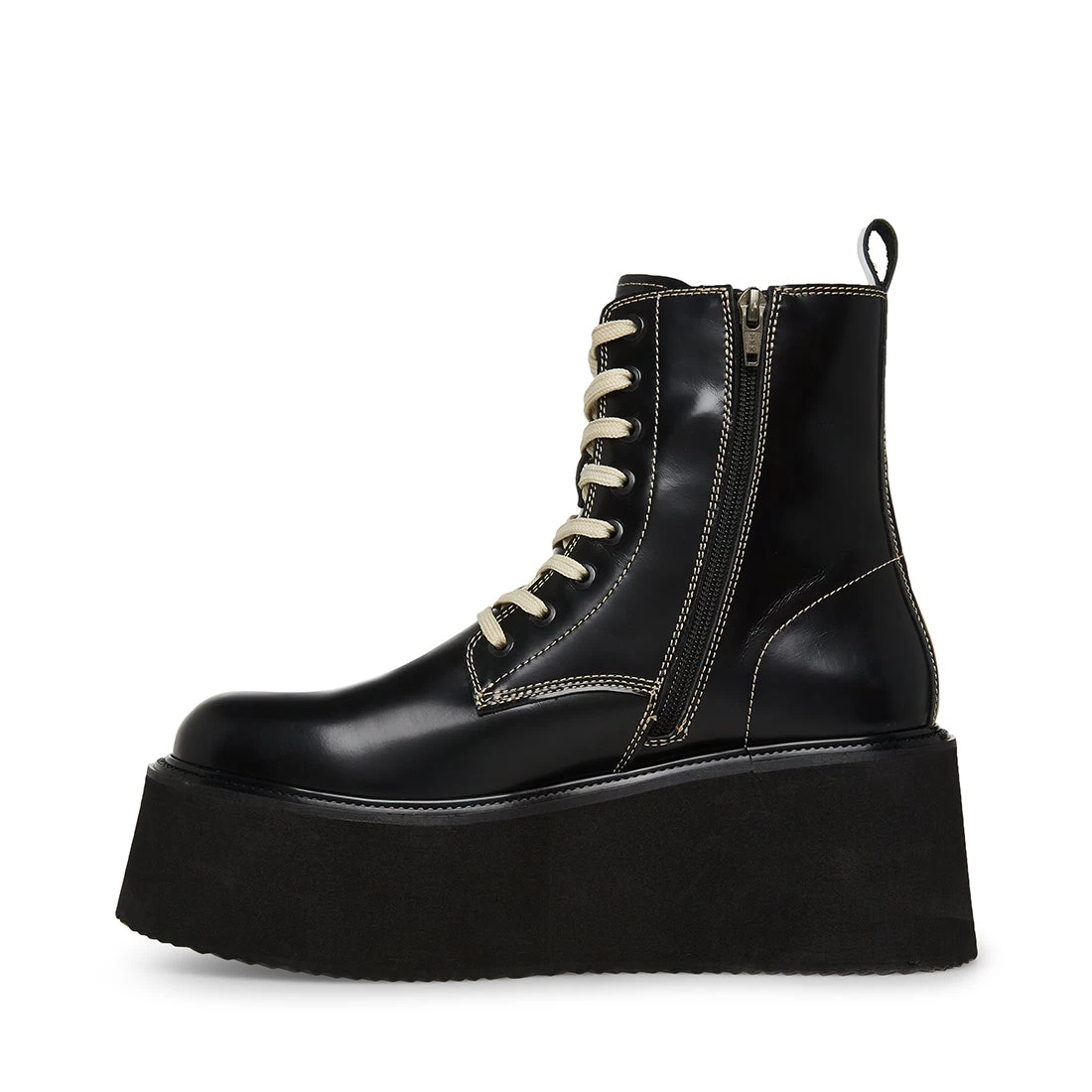 The LAZER ankle boot is a combat boot design set on top of a high flatform sole and accented with contrast stitching and laces.