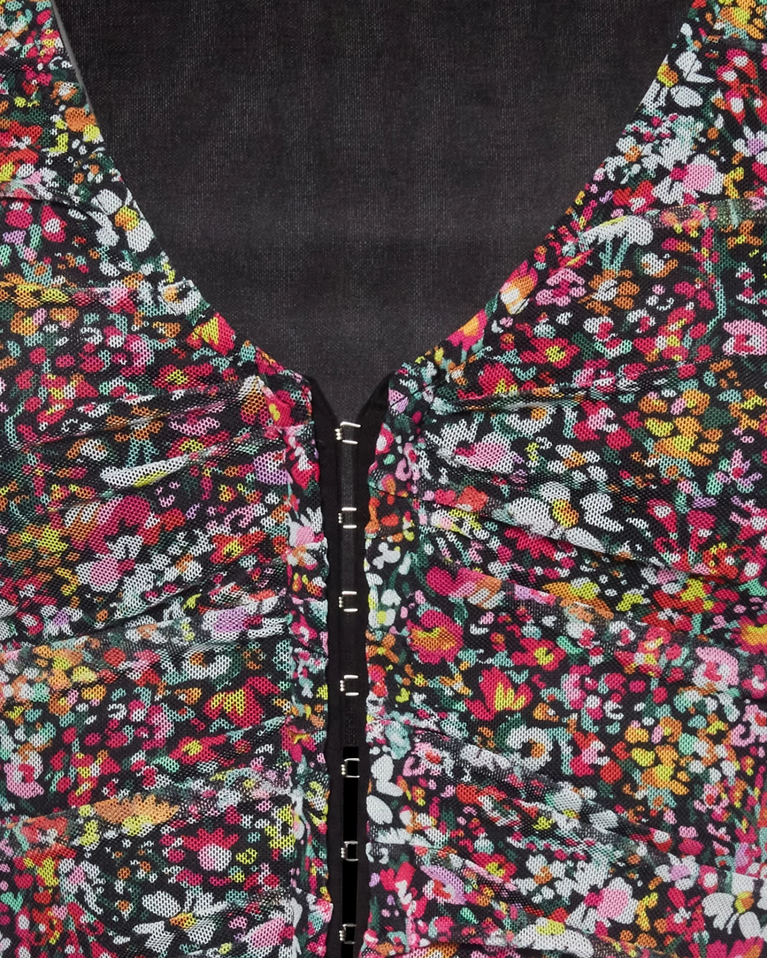 The LUNA mesh top is designed with flattering ruching around the deep V neckline and along the hook-and-eye closure down the front.