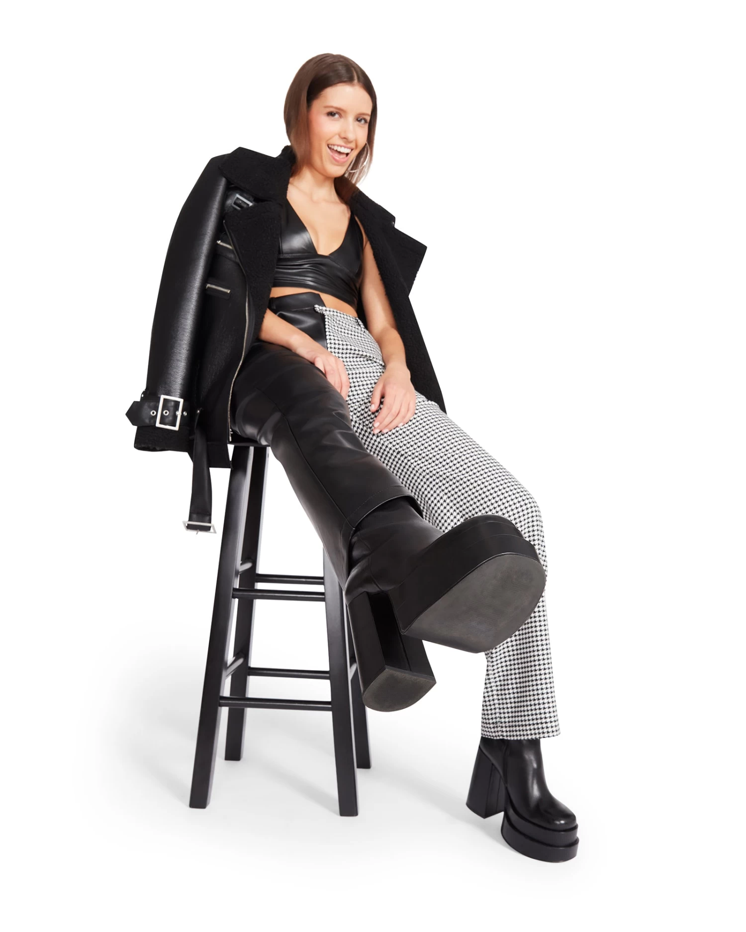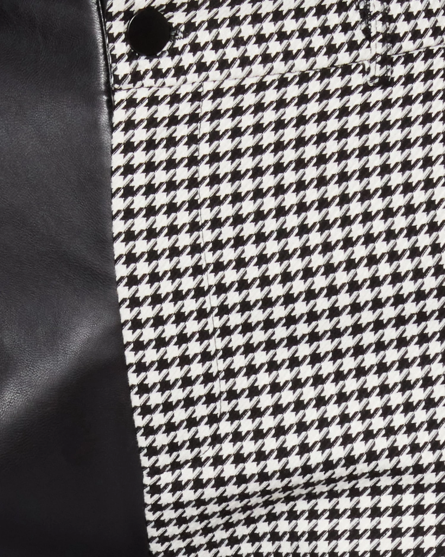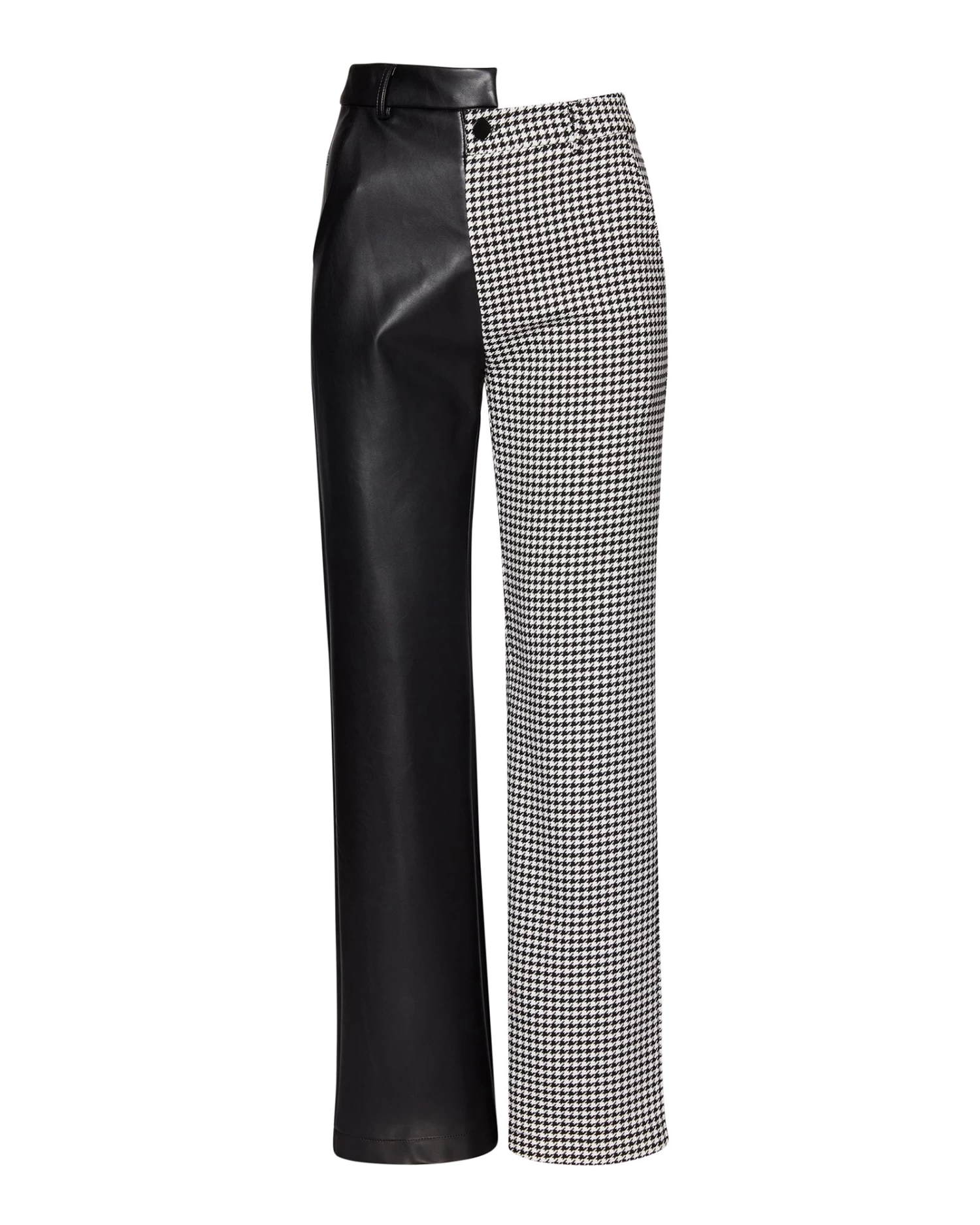 - Split color design with one leg in vegan leather and the other in houndstooth
