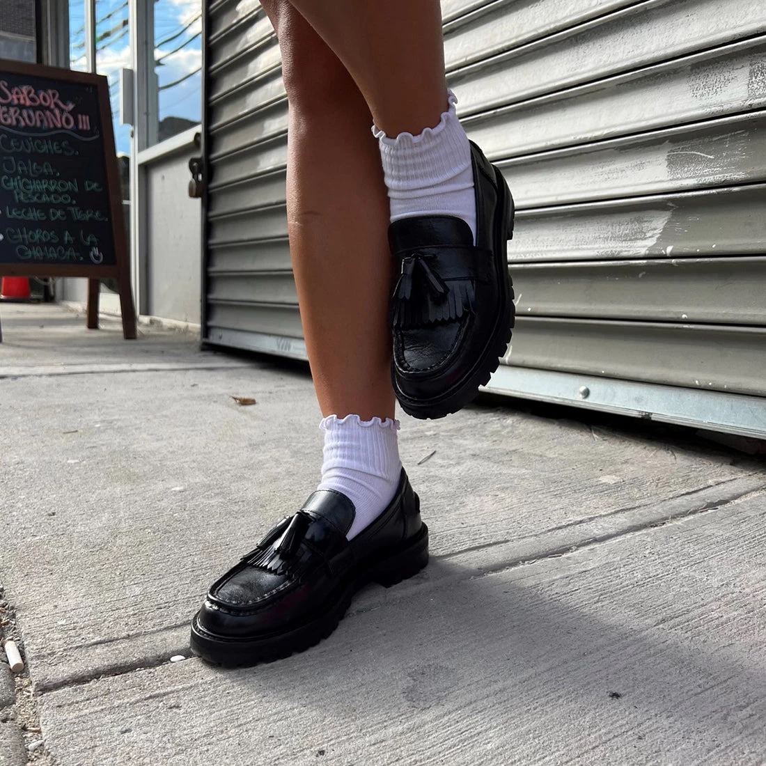 The MINKA leather loafer features both fringe trim and tassels at the top with a treaded platform sole for extra texture.