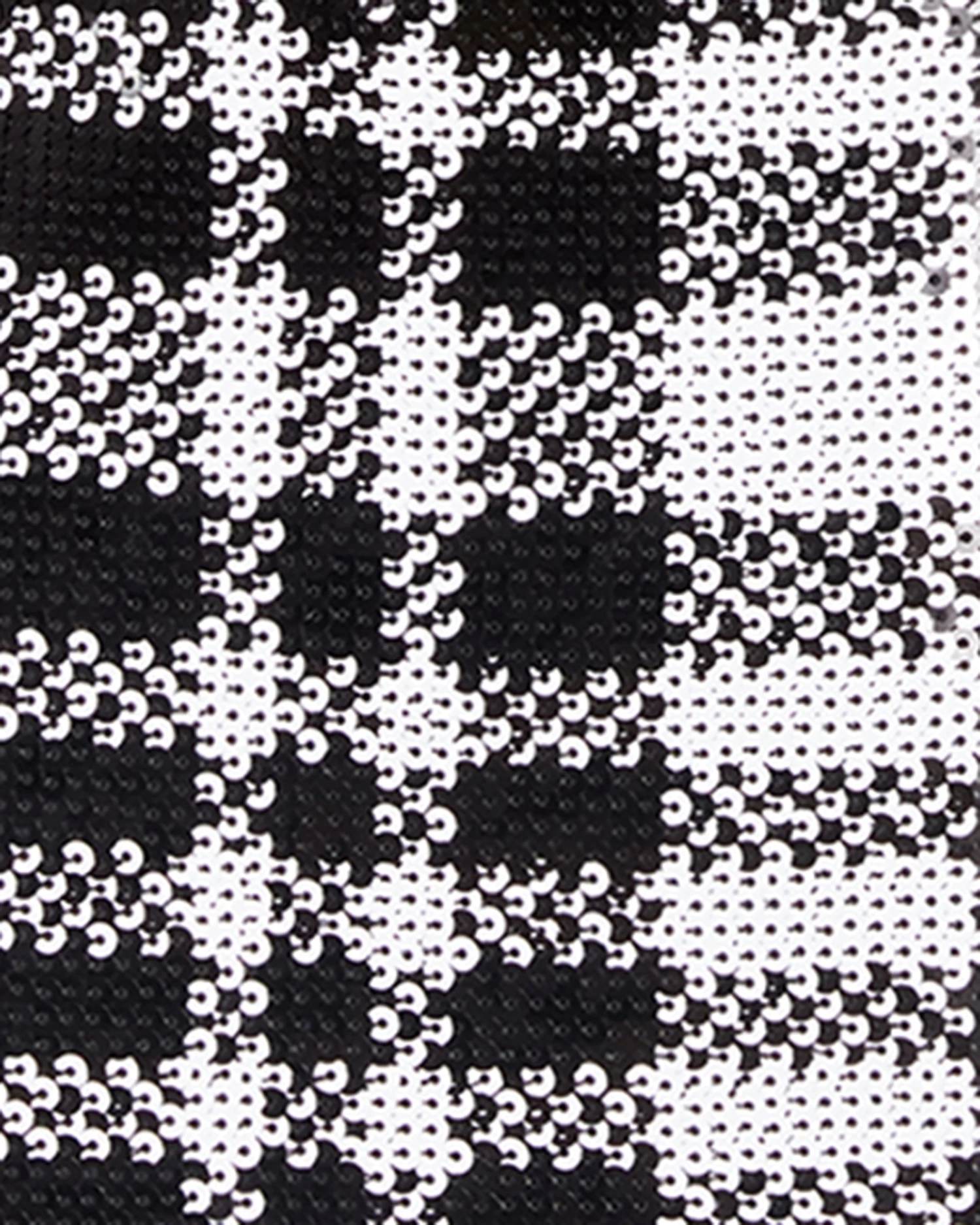 The RETA mini dress features a sleeveless notched neckline and a plaid patterned sequin finish.