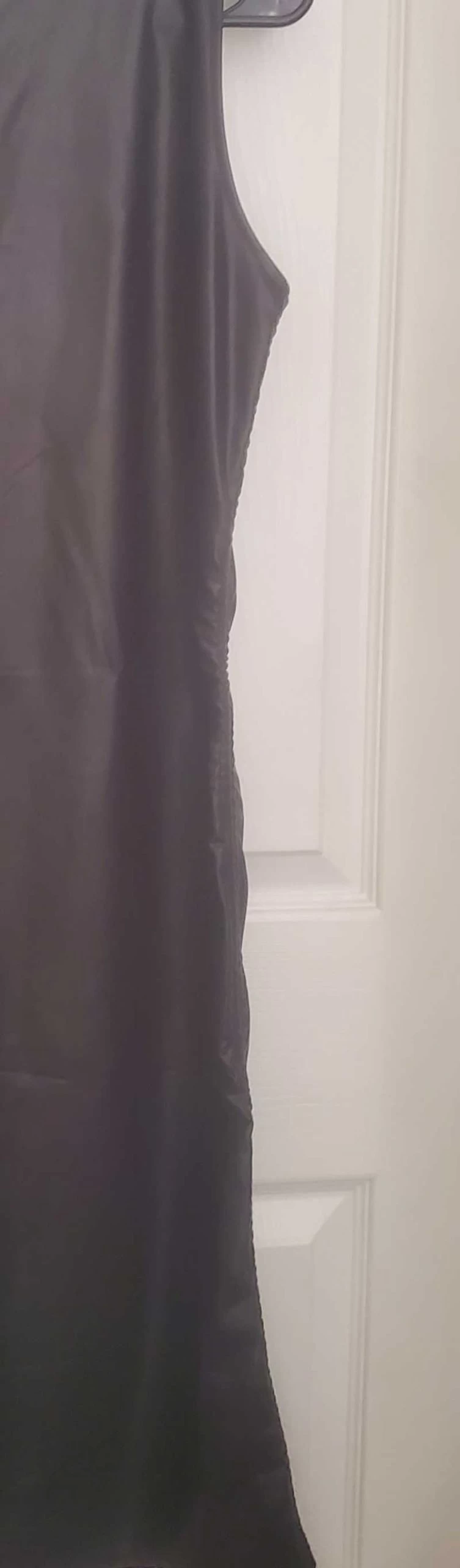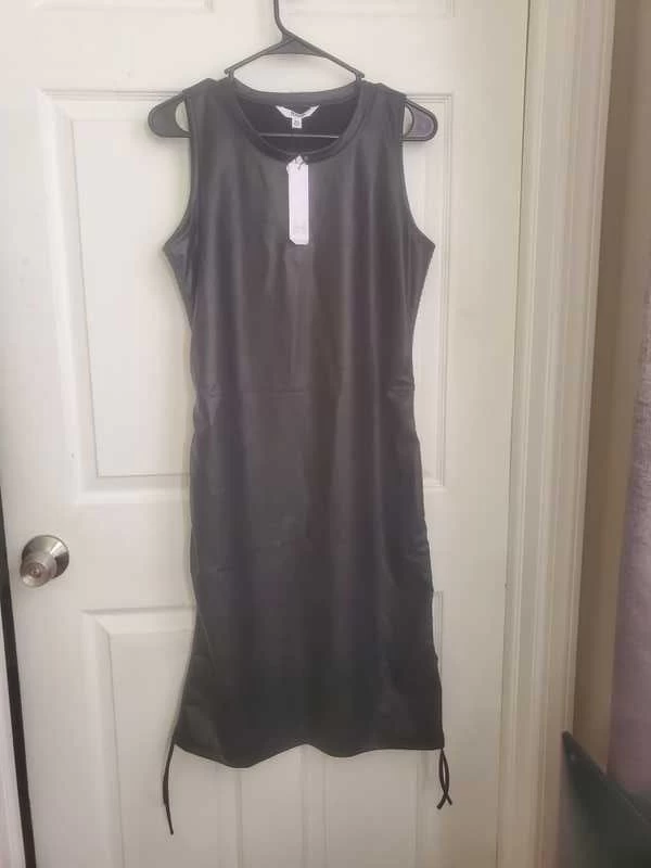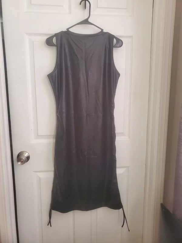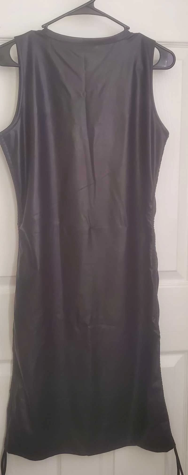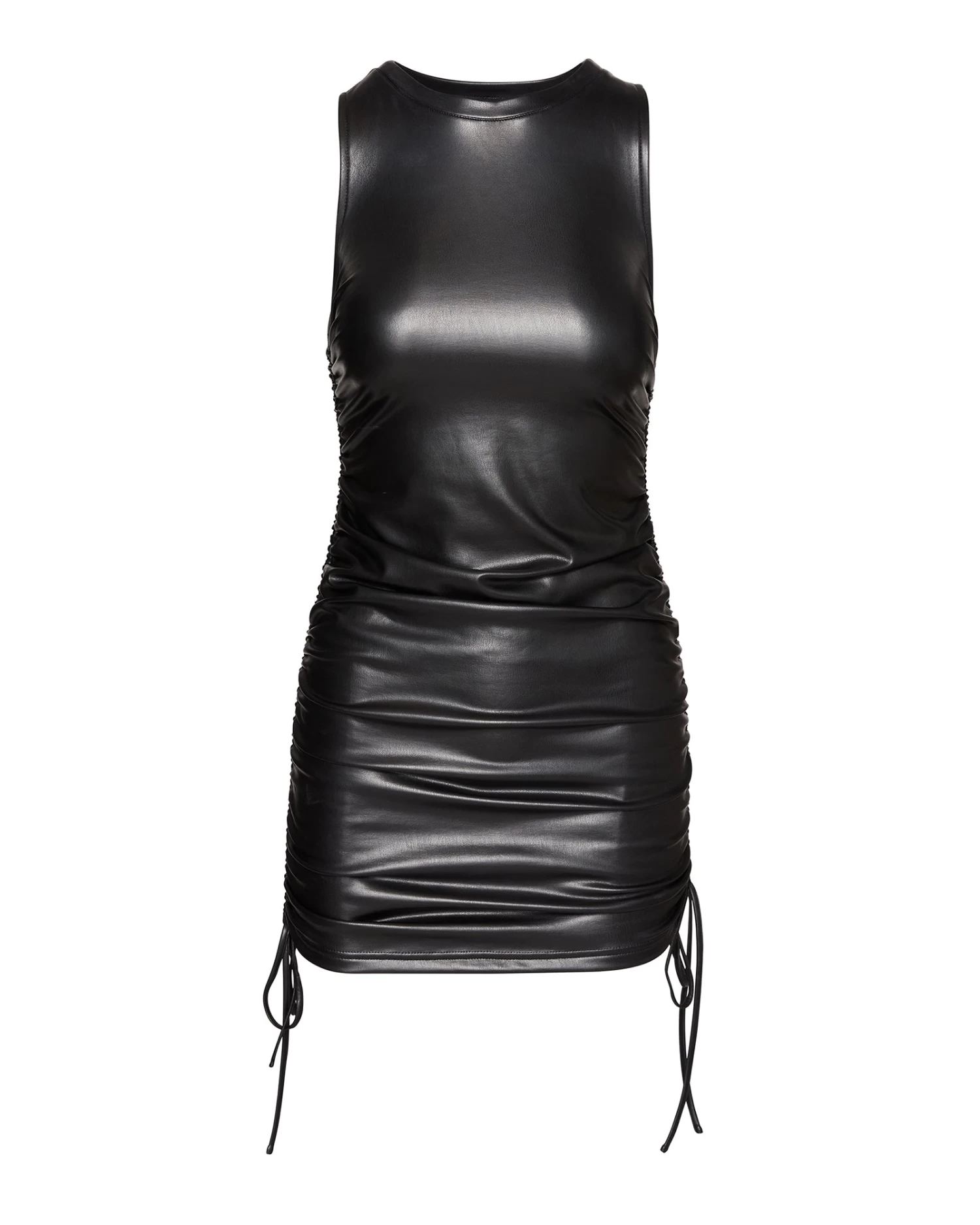 Faux real, babe. This vegan leather mini dress features ruched details with adjustable side ties.