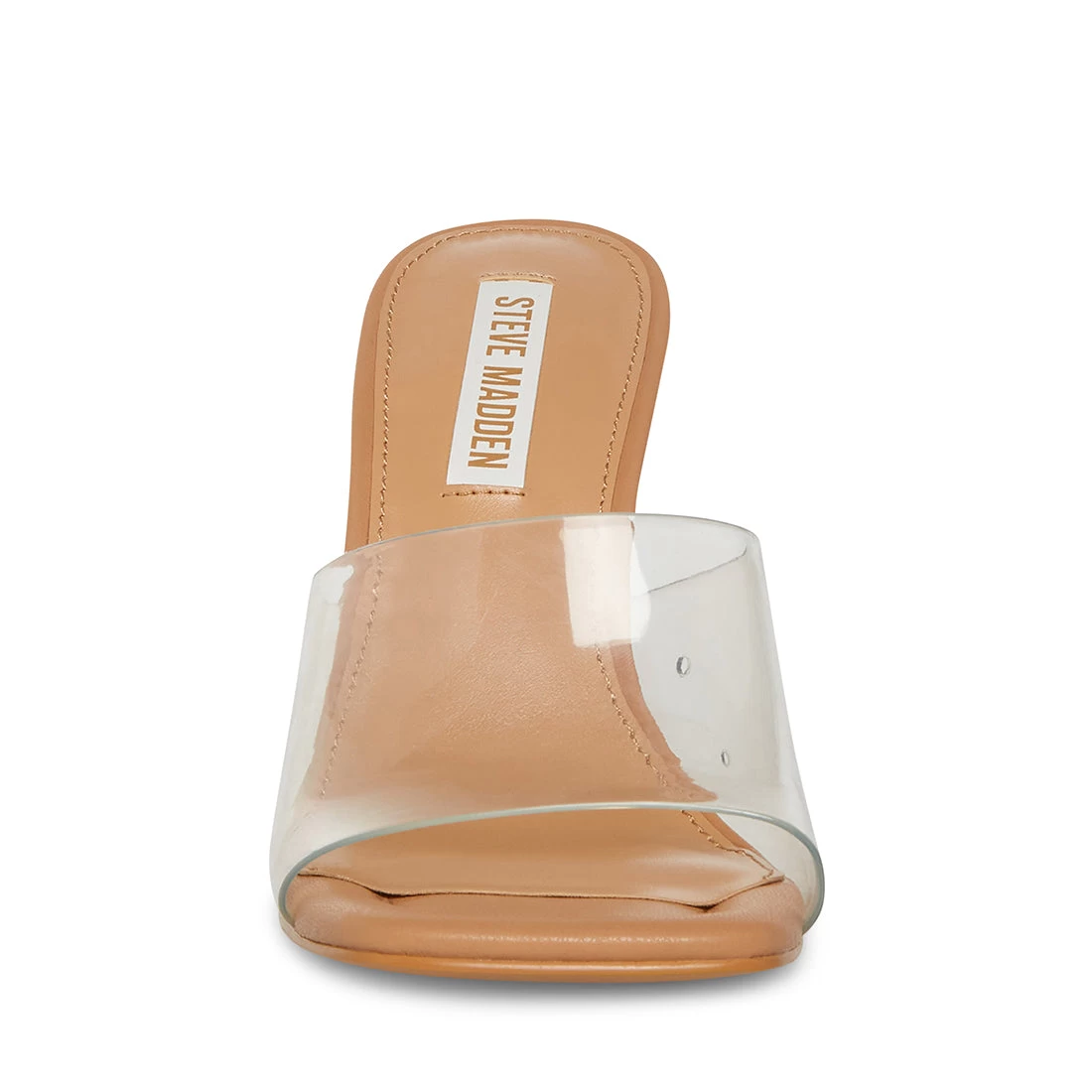 The SELENE slides set a single wide strap design on a square toe base with a stiletto heel, updating a classic dress sandal with an angular silhouette.