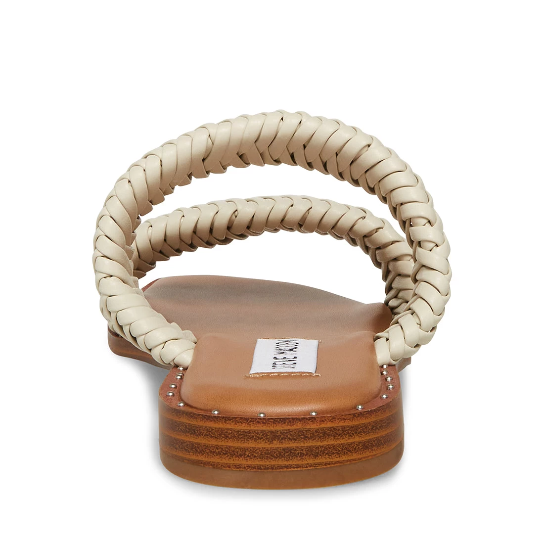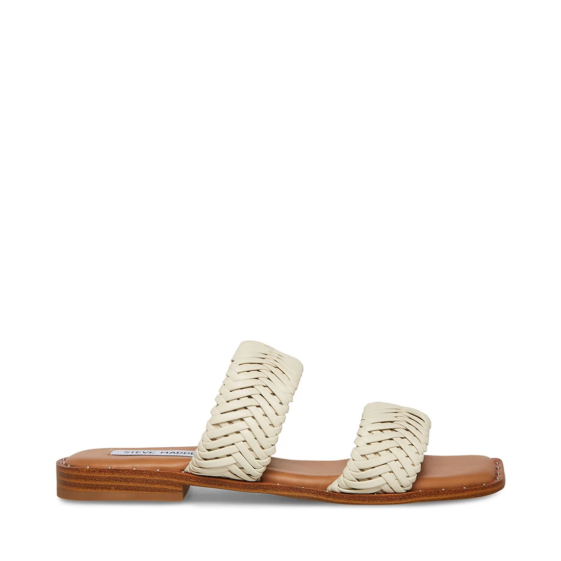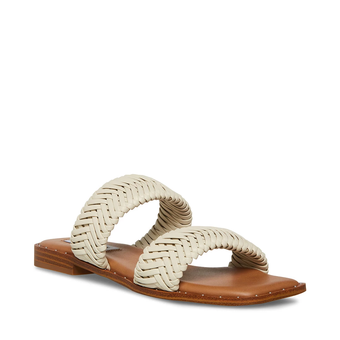 The SHARYN sandal is a square toe flat slide with two wide woven straps and mini stud embellishments around the sole.