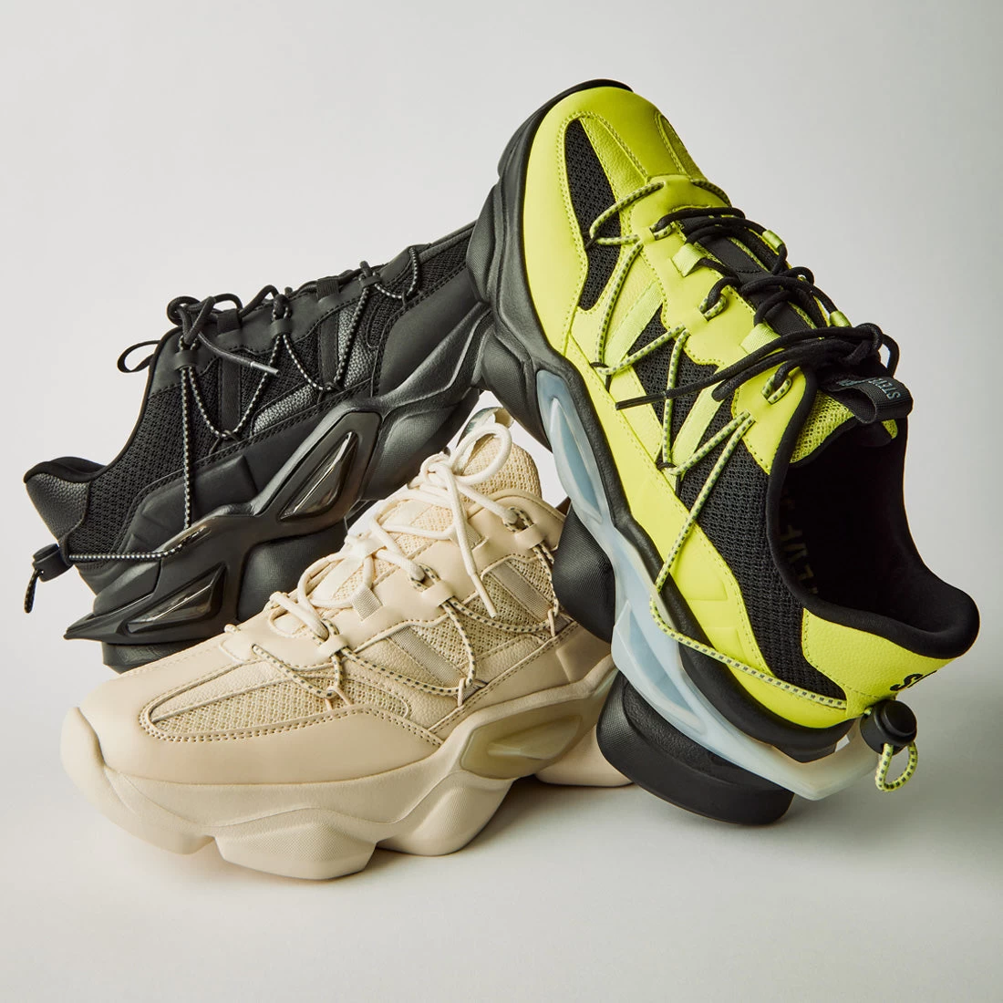 STORM is a chunky platform sneaker with a scultpural molded sole and layered, textural embellishment, including mesh panels, webbing straps, and stretch cord laced over the sides and around the back.