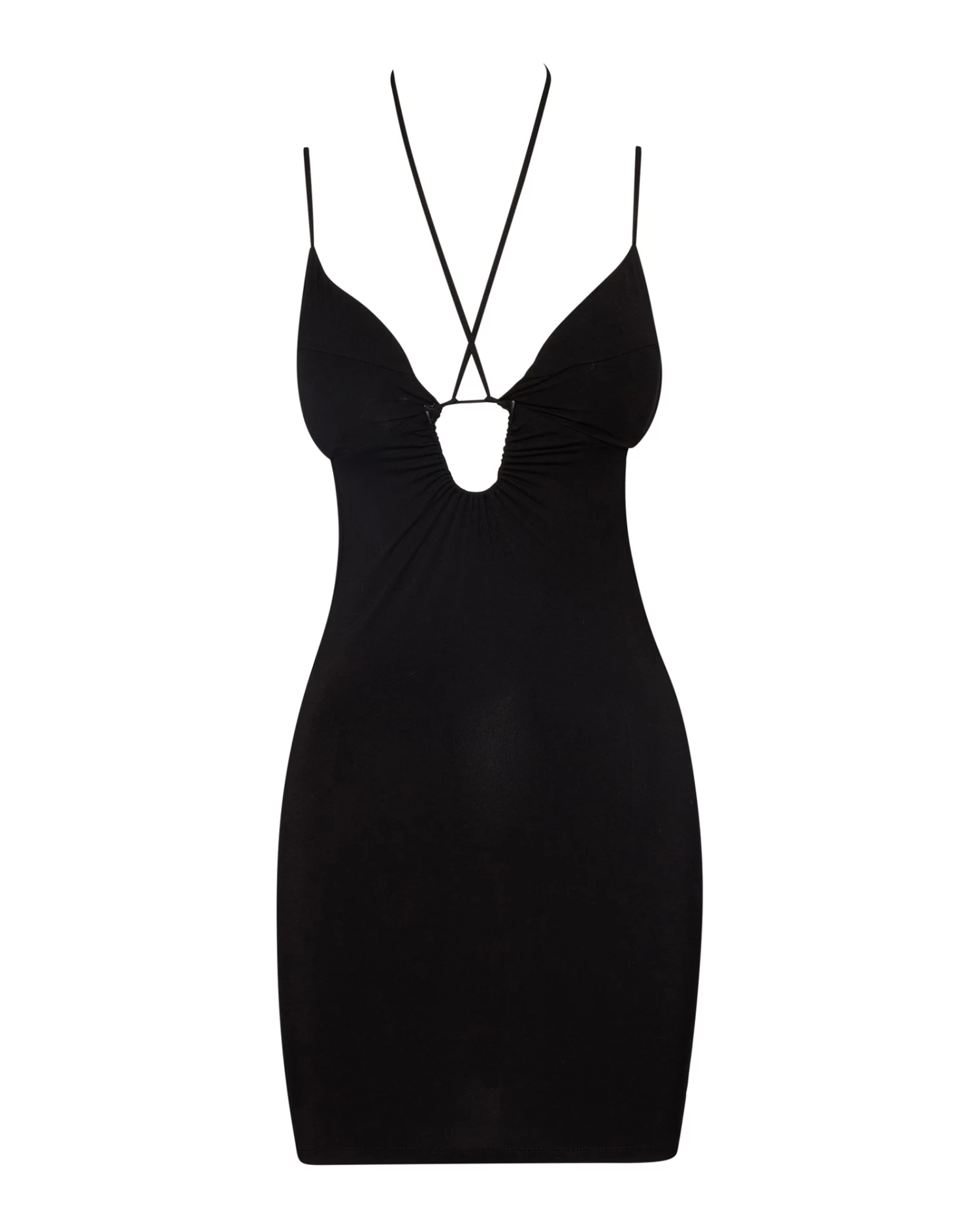 The TIEGAN mini dress features daring cut outs on the back and neckline with crossed halter straps in addition to the adjustable shoulder straps.