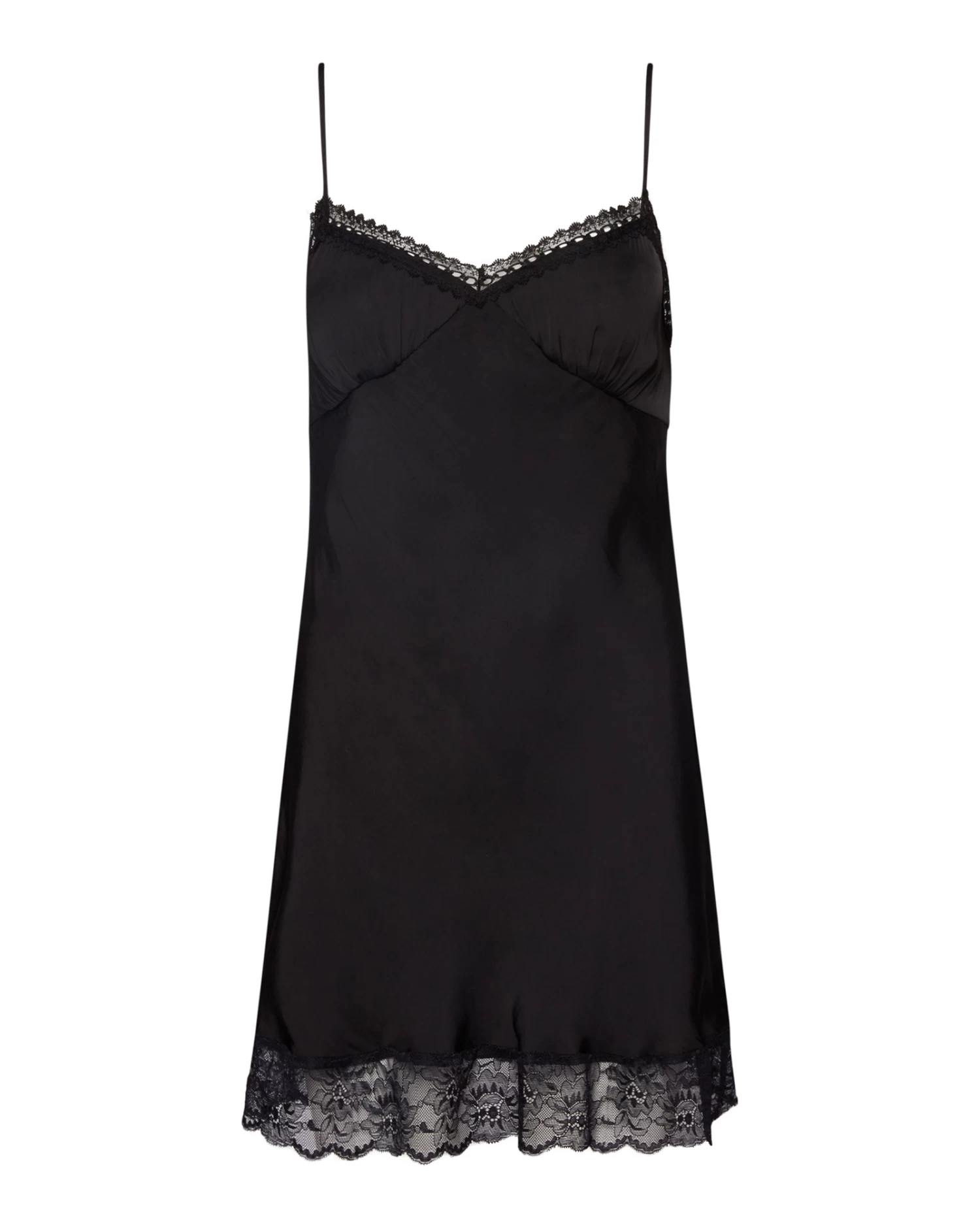 The VEERA dress is a mini length slip with lace trim at the hem and neckline.