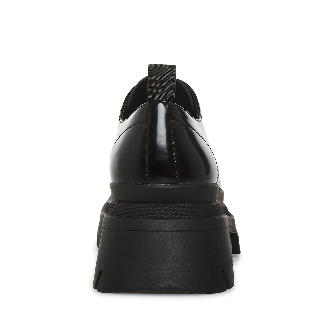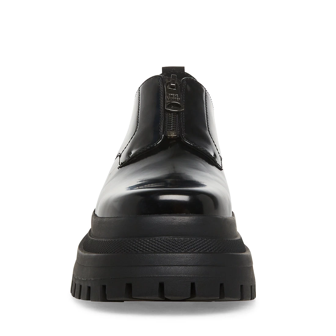The ZIP derby shoes feature a high shine finish on the smooth upper, set on a wide heeled platform sole with a heavy tread.